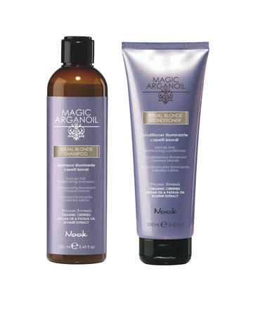 Glansgivande reparerande shampoo och balsam för blonda, blekta och slingade hår. Vegan formula med skyddande och närande arganolja, patauaolja återfuktar och reparerar. Dessa hårprodukter vitaliserar och reparerar blekta blonda hår, samtidigt elimineras gula & orangea oönskade toner i håret.